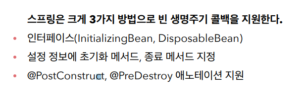 스프링은 의존관계 주입이 완료되면, 스프링 빈에게 콜백 메서드를 통해서 초기화 시점을 알려주는 기능을 제공.