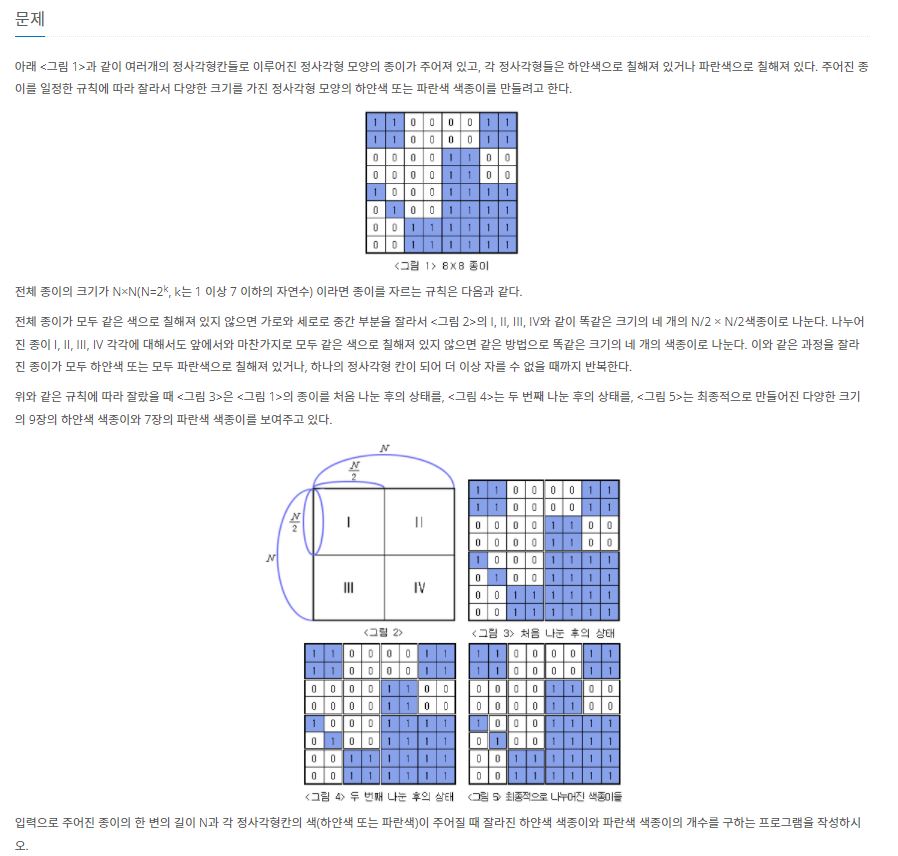 종료 조건으로 N 범위내에서 모두 같은 수인 경우 -> (파란색 칸 + 1 or 하얀색 칸 + 1)을 하도록 하고,